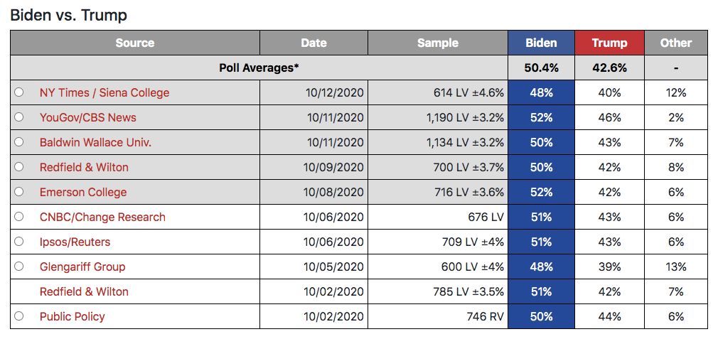 Eso le dice a Biden que necesita más de un 3.2 por ciento de ventaja para derrotar a Trump. A partir del día 13, Biden tenía una ventaja del 10 por ciento sobre Trump.