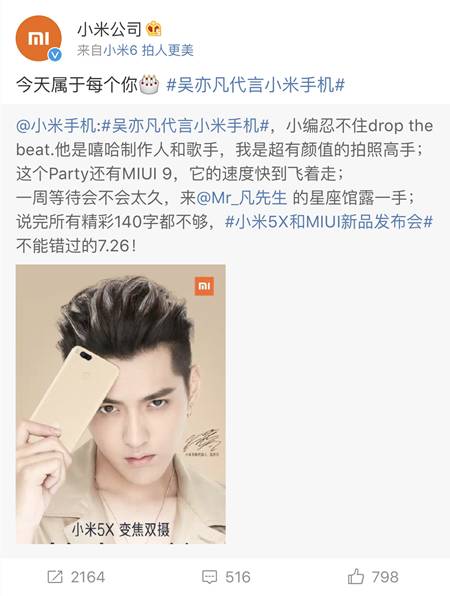 昨日、Xiaomiの携帯電話は、公式マイクロブログを通じて、Wu Yifanが正式にXiaomi 5Xスポークスマンになったと発表しました。 新商品は7月26日に発売され、Xiaomi 5Xに加えてMIUI 9も発売される。