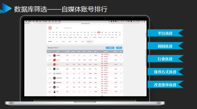 (1)メディアアカウントからのランキング:ユーザーは、プラットフォーム、時間、業界、ソート方法の選択、またはソート順序の変更、カスタマイズされたサービスのカスタマイズを必要に応じて行うことができます。