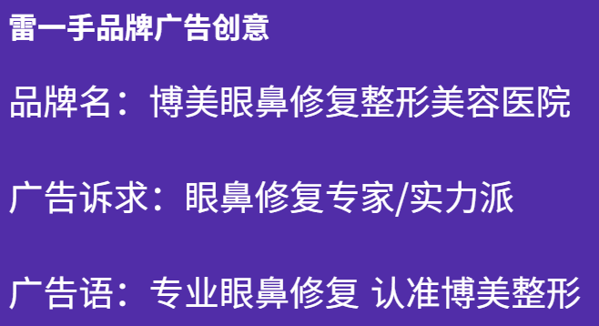3、広告の言葉。オリジナルの広告は、次の機能も提供します。匠は美の実力派を造った。クリエイティブ広告は次の方法で最適化されています。プロの目と鼻の修復は、ボミー整形を認識します。
