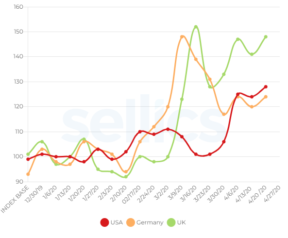 • 米国、ドイツ、英国を含む3つの主要市場でのPPCのパフォーマンス動向を分析し、2019年末から4月末まで分析します。 また、流行による市場の変化やイベントが広告の重要な指標にどのように影響するかも議論されます(この分析は、広告主のSponsored Productsに基づくSellicsのパフォーマンスデータです)。 含まれる傾向とデータは、Amazon広告の公式パフォーマンスを表すものではありません。• 現在のアウトブレーク中および状況が継続している間に、売り手が成功した広告キャンペーンを実施できるように、広告ガイドラインを提供します。全体として、ここでは、Amazonの広告の全体的な傾向は、アウトブレークの危機が始まって以来観察されています:•これは、トラフィック(広告のクリック)の増加によって支えられています。• 広告パフォーマンス(ACOSおよびROAS)の改善