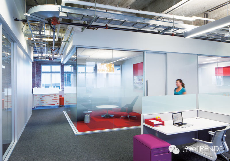 ワグナーは、シャンデリア、カジュアルな家具、コーヒーショップスタイルの中央集結エリア、カラフルなエリアカーペットを使用して、オフィスのデザインを柔らかくし、商業化を遅くします。