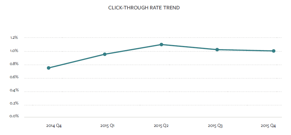 Desde el cuarto trimestre de 2014 hasta el primer trimestre de 2015, los clics en los anuncios crecieron considerablemente más rápido que el gasto y la exposición de anuncios en el mismo período, lo que tambiénEl precio unitario de los clics ha disminuidoEl cuarto trimestre disminuyó un 33% interanual en 2015 y se mantuvo por debajo de 0,5 USD en el conjunto de 2015.